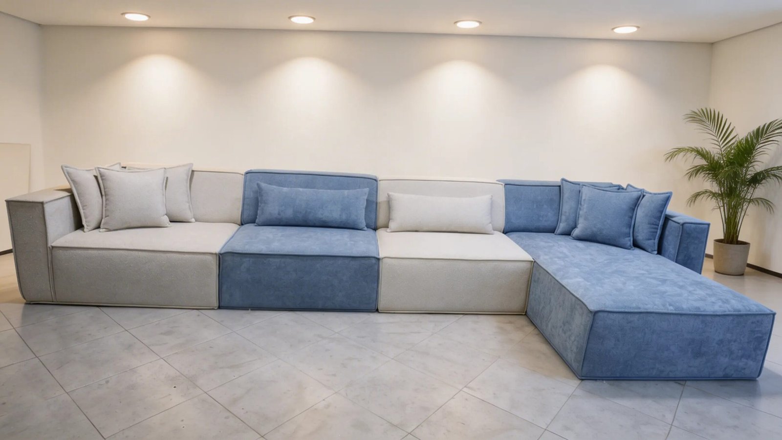 Le Salon Élégance associe 2 modules centraux, un module avec accoudoir et un module lit avec accoudoir, offrant une configuration à la fois moderne et fonctionnelle.